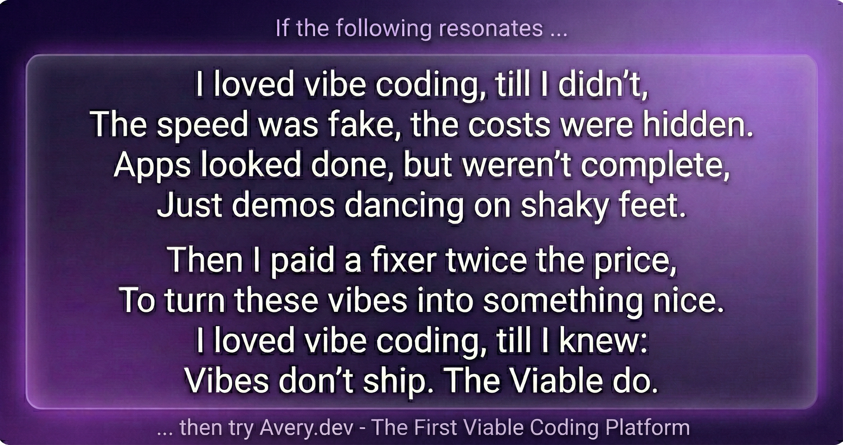 We created Avery.dev because we believe the fundamental premise of vibe coding was right: that AI should make building production software accessible to more people. But the business model of first-generation platforms was wrong.